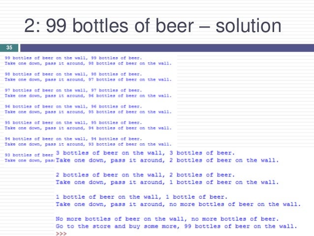 Introduction To Python 2 Part 2 2 from image.slidesharecdn.com 99 bottles of beer on the wall, 99 bottles of beer on the wall join authorsden ! Why are there no more bottles of beer on the wall? 99 bottles of beer on the wall by atticus, from the album figment (2001). Take one down and pass it around, 98 bottles of beer on the wall. It is a traditional reverse counting song in both the united states and canada. More images for 99 bottles of beer on the wall » Anonymous guy uploaded this piece of art several years ago on limewire. Welcome to 99 bottles of beer.